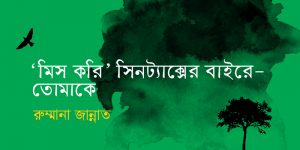 রুম্মানা জান্নাতের কবিতা ‘মিস করি‘ সিনট্যাক্সের বাইরে, তোমাকে— [উৎসর্গ- তোমাকে জন্মদিনে, যে আমাকে দেখিয়েছিল গোল গোল ভাষা!] ১. আয়নার ওইপাশে খোলা ছাদ— দুইটা পাখি বসে আছে। তাদের আমি সম্পাদক